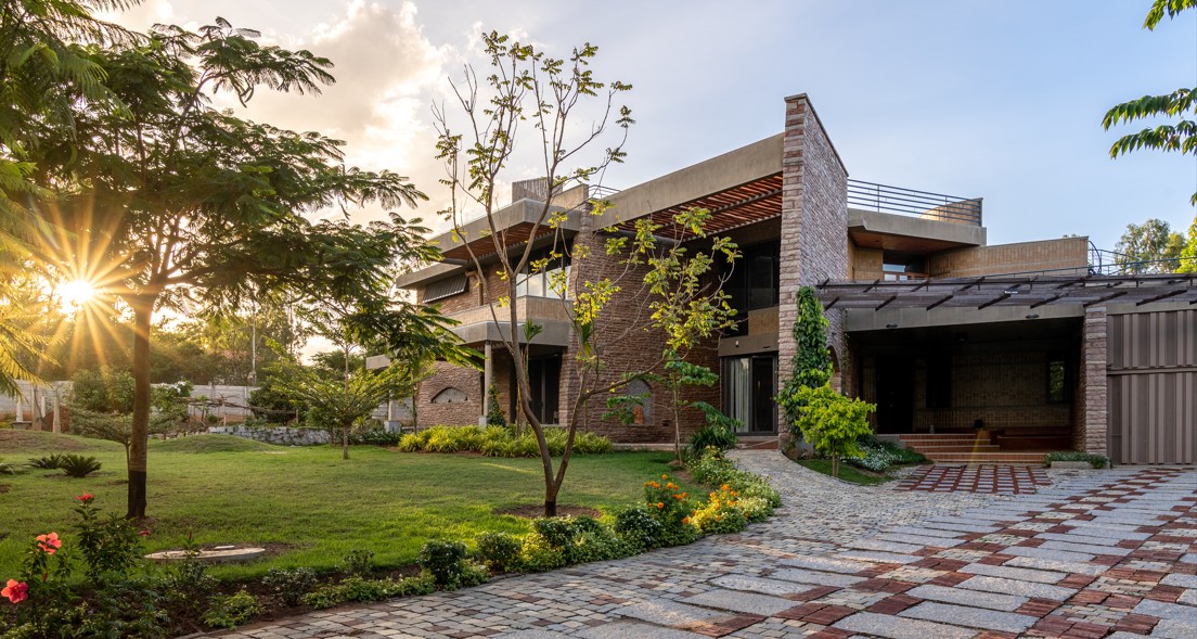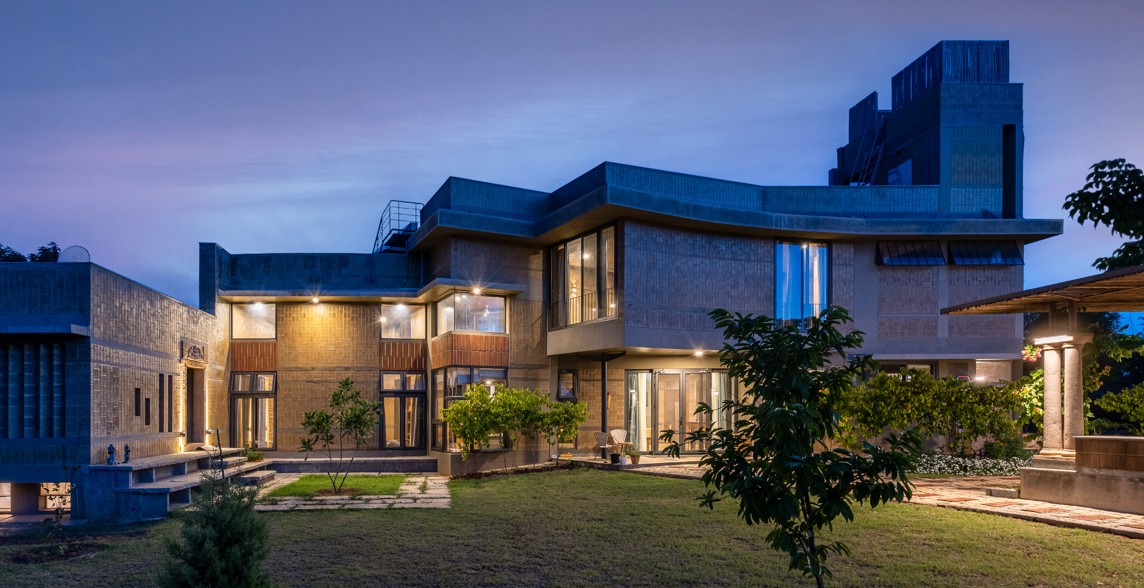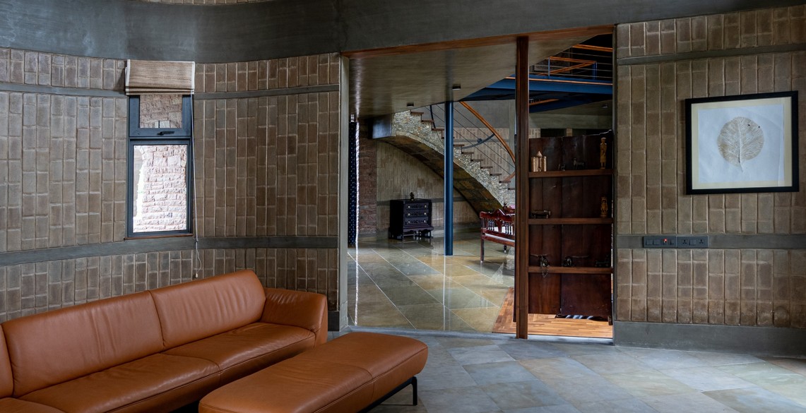Nestled within a lush green stretch in Hosur, Tamil Nadu, this home strikes a delicate balance—standing out through its bold pink chappadi stone façade while effortlessly blending into its natural surroundings. The design integrates earthy materials such as Kota stone, soil-cement blocks, and reclaimed wood, creating an eco-friendly yet eco-responsive dwelling. A distinctive boomerang-shaped lightwell adds to the spatial experience, casting ever-changing light patterns that animate the interiors throughout the day.