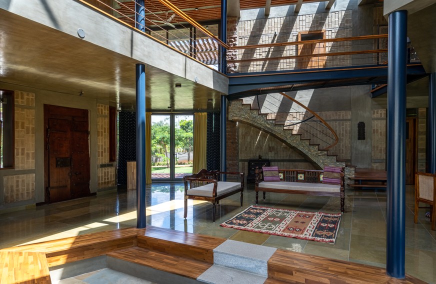 Staying true to eco-conscious building, most wall and roof materials were crafted from local soil. Thick stone walls on the southern and western sides help insulate against heat, while thoughtfully placed shaded openings ensure natural ventilation throughout the house. The generous scale of the spaces enhances comfort while evoking a sense of quiet luxury.